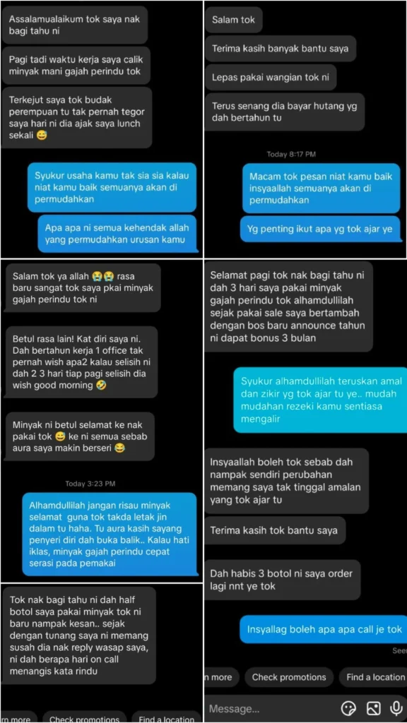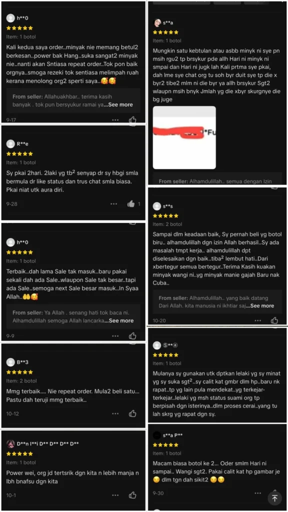 Dah kahwin dekat 30 tahun, sejak sebulan dua ni suami berubah sgt, terasa makin jauh tak tau apa yg tak kena..sedih tktau apa nk buat. Ternampak iklan minyak ni di facebook. Sekarang dah amalkan selama 3 minggu, banyak perubahan, husband dah kembali bercakap mcm awal2 kahwin dulu..Dia semakin riang...